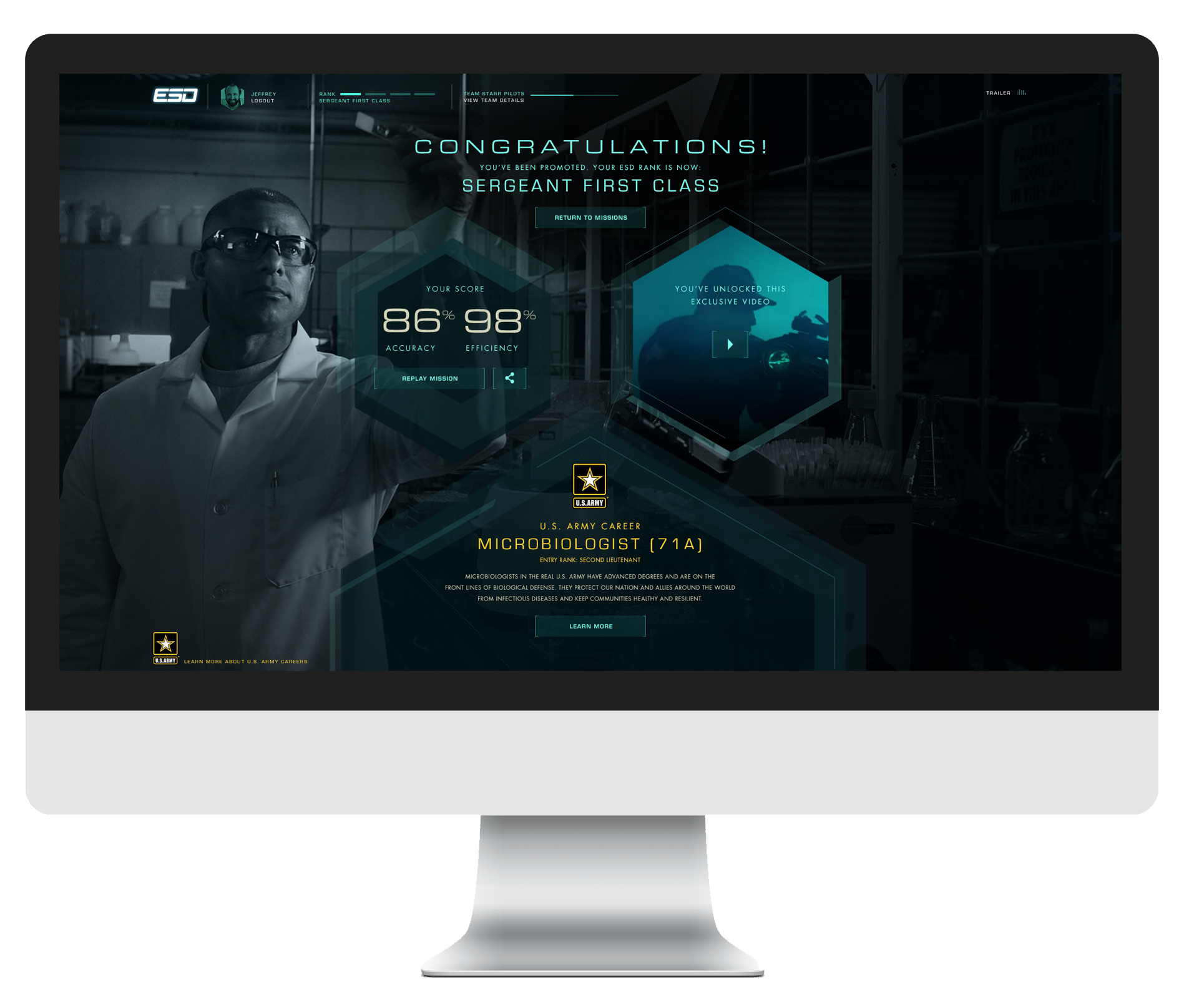 MRM//McCann hired Gravy Boat Regatta to work on an interactive digital experience. The site was the center of a larger co-branded recruitment campaign between 20th Century Fox’s movie, ‘Independence Day Resurgence,’ and the U.S. Army. The site featured four mini-games, each simulating a different role an Earth Space Defense soldier would be asked to perform during an alien invasion. The games provided U.S. Army recruitment with viable leads for specialized roles, including: microbiologists, cryptologists, mechanics, and pilots.